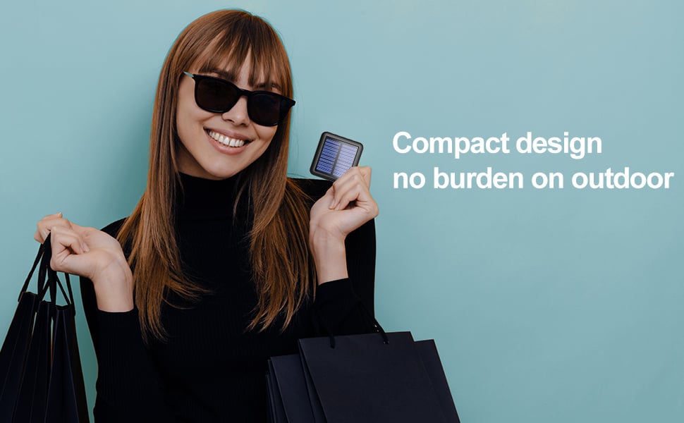 One of the smallest and lightest solar power bank. only 3.64*3.07*1.02inch ,it's easy to put in your pocket or bag.
